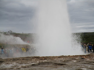 A unha hora ou así en coche está a zona de xéiseres máis famosa co Geysir propio que dá nome a este fenómeno natural e que agora rara vez bota vapor e o Strokkur que si bota vapor cada 4 - 8 minutos para admiración dos turistas que nos xuntamos ao redor. Esta visita foi das poucas nas que tivemos descanso da chuvia que nos fixo compaña toda a viaxe.