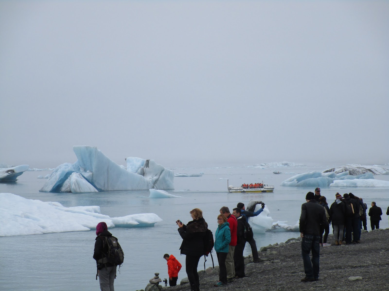 Paramos no glaciar Svínafellsjókull ( jókull significa glaciar ) que xa impresiona pero que non é nada comparado co seguinte que é o famoso Jokurlajókull onde rodaron películas de James Bond. Este glaciar xúntase co mar nunha lagoa resultado do cambio climático. Antes todo era un glaciar pero está derretendo rápidamente. Os anacos de xeos blanquiazul con raias negras de erupcións e de miles de anos de idade van aboiando cara ao mar coas súas formas abstractas. Impresiona o silenzo do lugar roto polos estralos dos icebergs que parten por onde menos contas. Polo medio hai barcos anfibios de turistas, zodiacs guiando eses barcos entre os icebergs e focas que asoman o fociño aquí e acolá. Foi unha escea maravillosa, hipnotizante e difícil de observar noutro lugar do mundo.