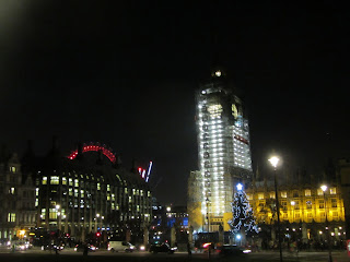 Seguimos o tour turístico en autobús con atascos pola zona de Harrods cos seus escaparates móbiles e pasamos polo Big Ben con andamios iluminados como todas as obras grandes da cidade.