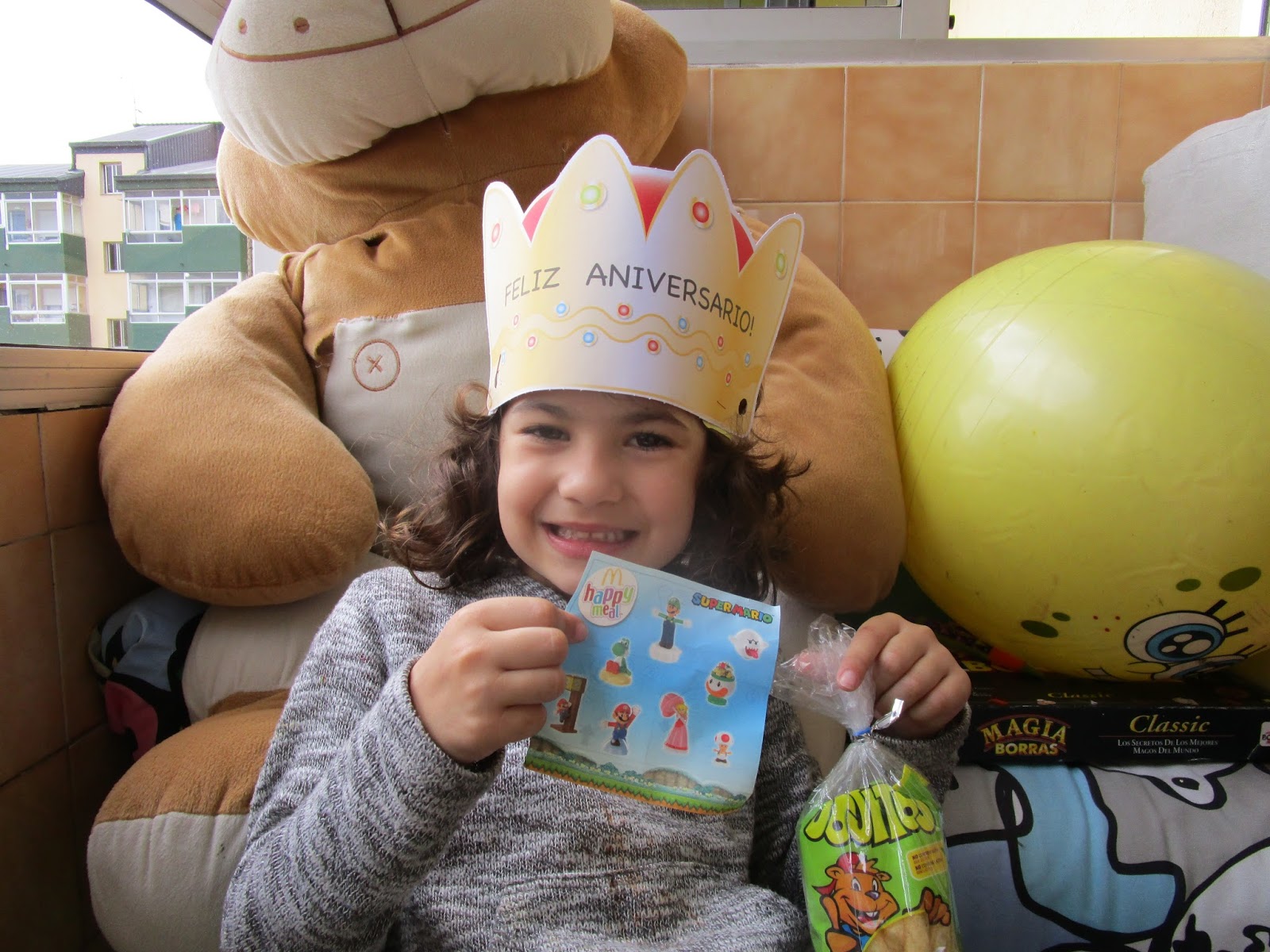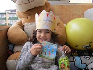 Neste día que empeza con fogueiras e trasnadas a nosa Xela fai os cinco anos. A xoubiña está toda contenta a pesar de que non tivo festa cos amigos. A festa foi coa familia e recibiu roupa e xoguetes ( unha pizarra, unha mochila, un peluxe de Everest, un moneco Yokai e o xogo Ido3D para facer figuras tridimensionais con rotulador ). Agora está toda entretida co seu dinosaurio tridimensional e a súa pizarra.