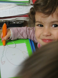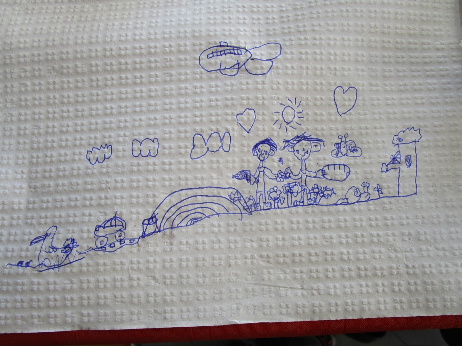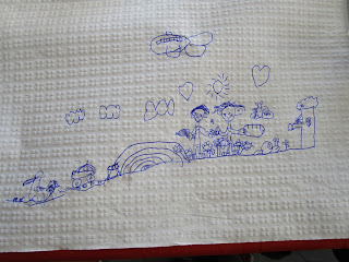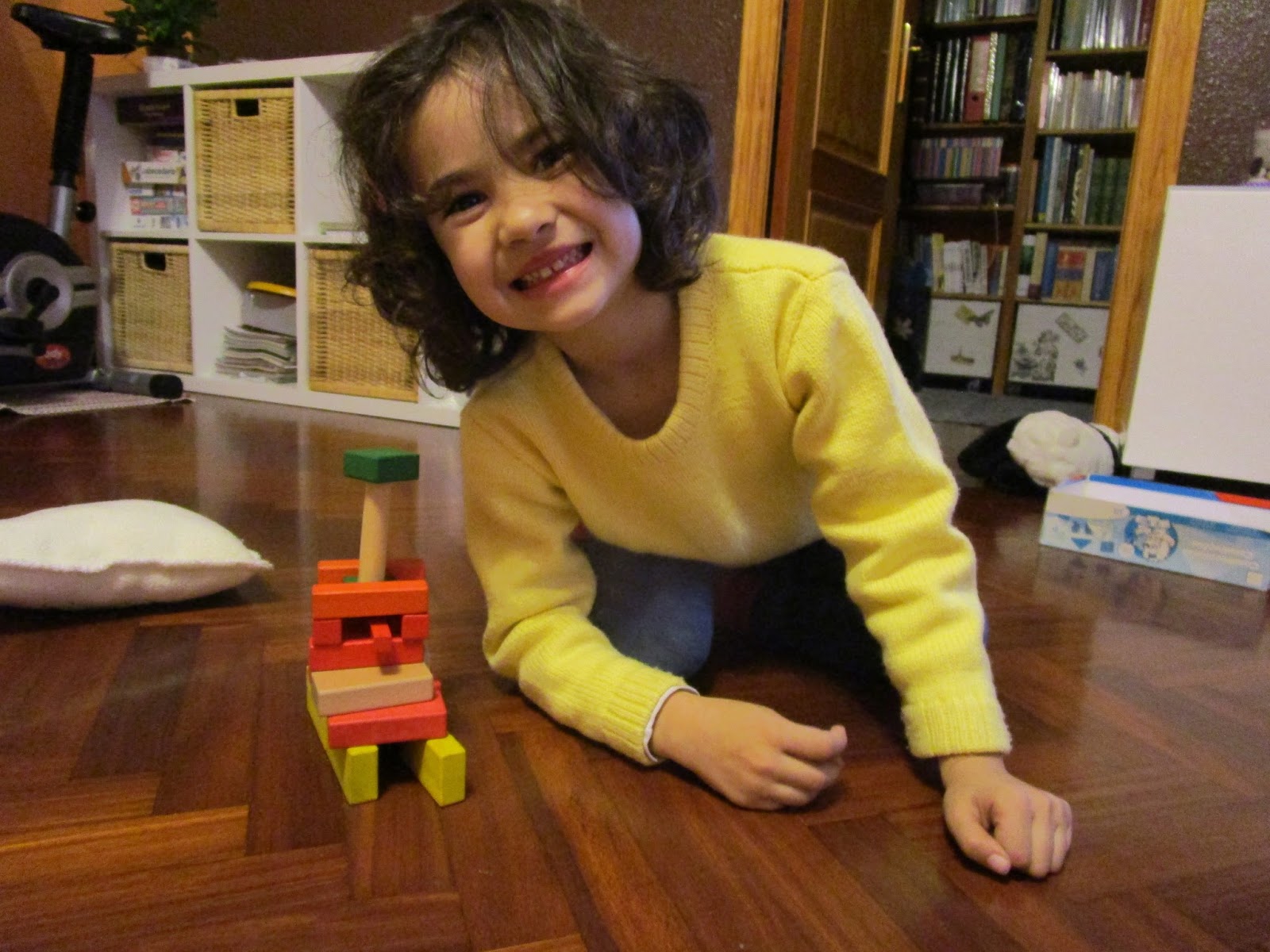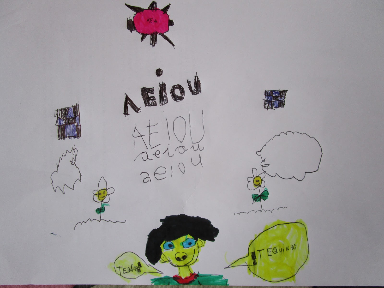 E os nenos van ben. O Leo flipando co doado que é buscar palabras no diccionario e Xela progresando coa escritura e debuxo. Aquí estou eu rindo cos ollos coma montañas, Naideleo está de amarelo cunha moeda de céntimo diante e Xela de azul e Leo de verde.